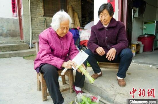 圖為102歲的鞠蘭英老人正在理菜。中新社記者吳淘淘攝