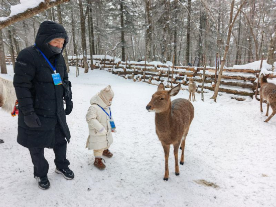 行至景區(qū)中心處的“粉雪部落”,濃郁的東北風(fēng)情撲面而來!爸侨⊥⑸健敝黝}場景成了最熱鬧的打卡點(diǎn),歡聲笑語不斷。鹿園里,孩子們輕輕撫摸馴鹿、喂食苔蘚,體驗(yàn)著與森林精靈親近的樂趣。“在南方從沒見過真正的馴鹿,這種體驗(yàn)太難得了”,來自云南的段先生一邊錄制視頻,一邊準(zhǔn)備向家人“炫耀”這份難得的美好。