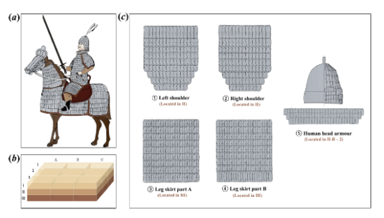 本研究對象是目前世界上已知最早的可復(fù)原甲騎具裝實物—出土于遼寧北票喇嘛洞墓地的珍貴遺存。研究結(jié)果表明,這套甲胄從結(jié)構(gòu)設(shè)計到材質(zhì)加工均體現(xiàn)出高度的技術(shù)成熟度,證明鮮卑在公元4至5世紀已具備先進的甲胄制造能力;而古蛋白質(zhì)組學(xué)分析首次證實,甲胄制作中使用了羊源材料——這一發(fā)現(xiàn)填補了古代游牧民族甲胄材質(zhì)研究的空白,為探討當時草原地區(qū)的動物資源利用、畜牧業(yè)發(fā)展與軍事手工業(yè)的關(guān)聯(lián)提供了直接證據(jù)。