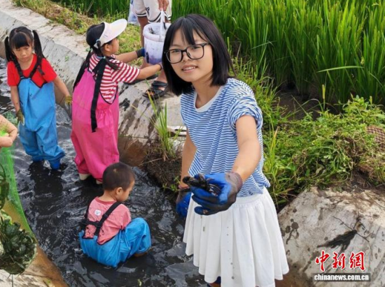 8月11日,2025年吉林省臺聯(lián)第五屆兩岸婚姻家庭親子夏令營走進(jìn)吉林市,營員們在稻田體驗抓螃蟹!↑S子珊 攝
