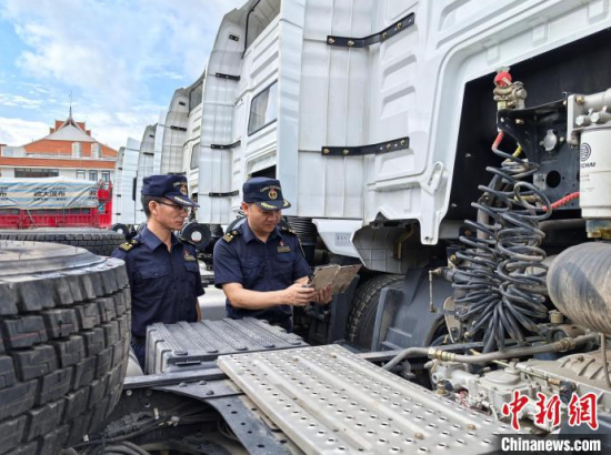 海關(guān)關(guān)員在關(guān)累港口岸對出口重卡牽引車開展查驗!】得 攝