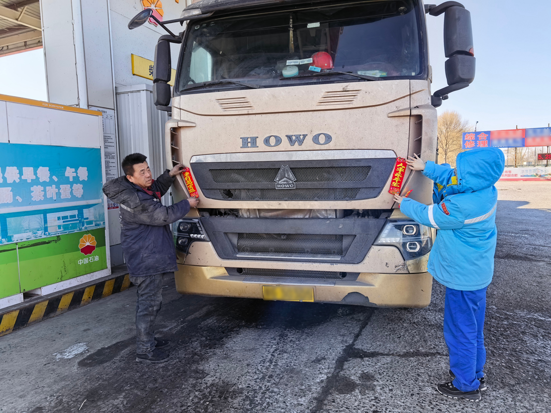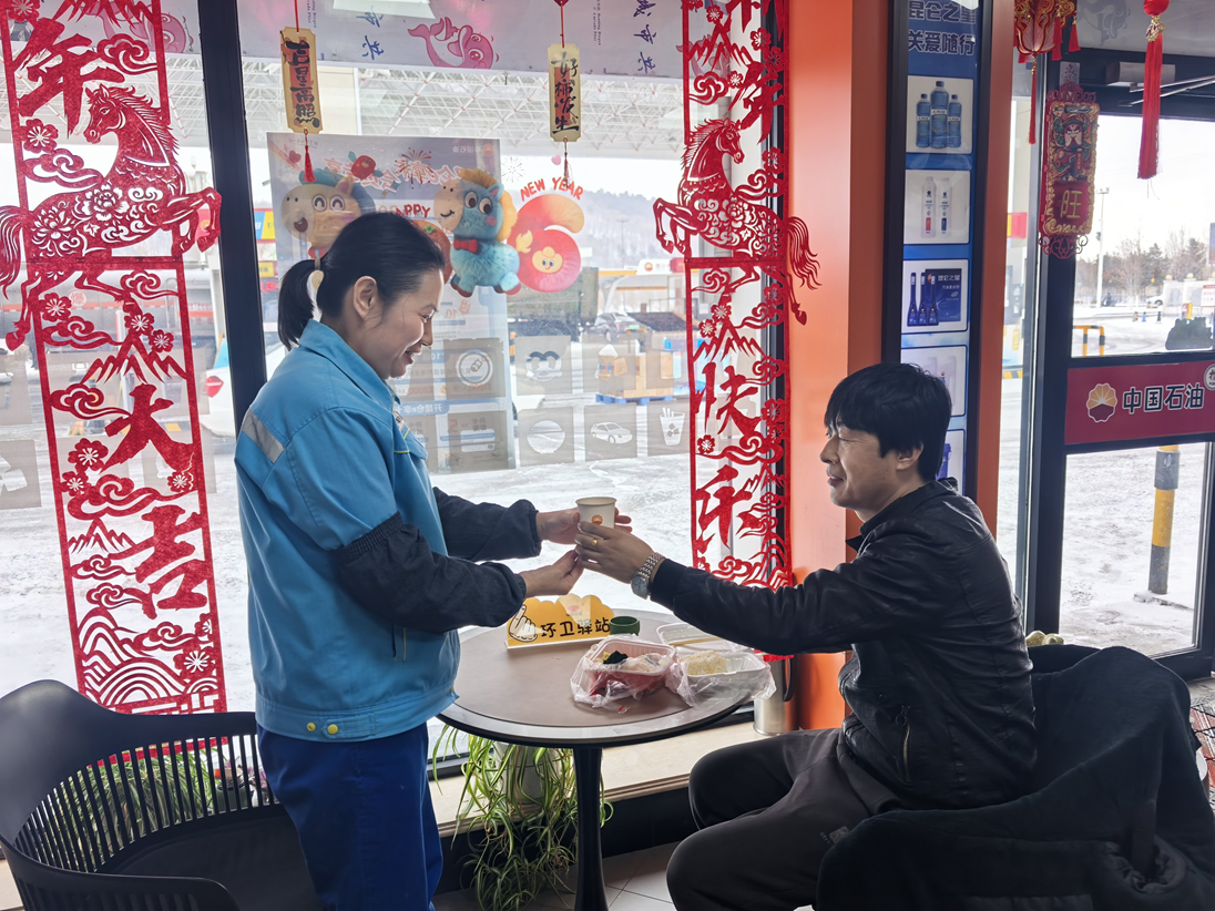 吉林市分公司磐石煙筒山站內(nèi),紅燈籠錯落懸掛,節(jié)日商品琳瑯滿目,休息區(qū)姜茶暖香四溢。“師傅,您跑長途返鄉(xiāng),胎壓有點(diǎn)偏低,需要幫忙調(diào)整嗎?”加油員一邊加油,一邊細(xì)心提醒,細(xì)致服務(wù)贏得司機(jī)連連道謝。
