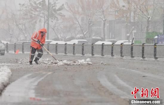 環(huán)衛(wèi)工人在街邊清雪。張瑤 攝