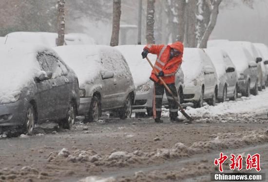 環(huán)衛(wèi)工人在街邊清雪。