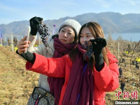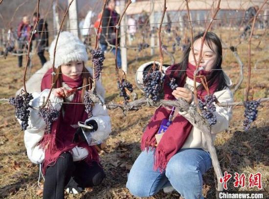 12月9日,吉林集安鴨綠江河谷,游客采摘冰葡萄。集安市所在的鴨綠江河谷與法國著名葡萄酒產地羅納河谷處于同一緯度,同屬世界葡萄酒黃金生產帶,當地所產的冰葡萄是釀制冰酒的主要原料。目前,鴨綠江河谷冰葡萄已經進入最佳采摘時期。(完)