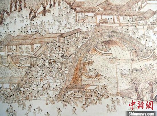 王巖用烙畫(huà)技術(shù)臨摹的明代清明上河圖。