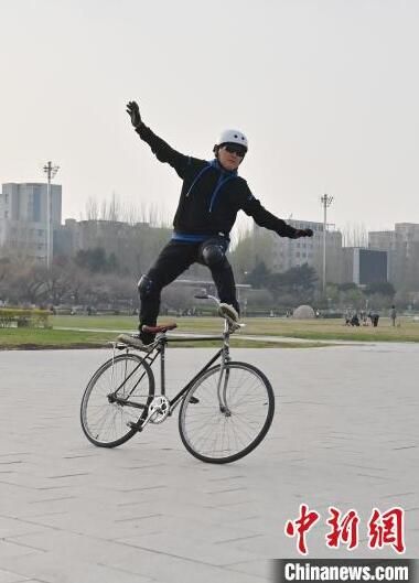4月24日,在長(zhǎng)春市文化廣場(chǎng)內(nèi),64歲的市民周長(zhǎng)春表演自行車花樣絕技。站立騎行、脫把騎行等一系列驚險(xiǎn)刺激的動(dòng)作被周長(zhǎng)春完成得十分精彩,吸引市民圍觀。