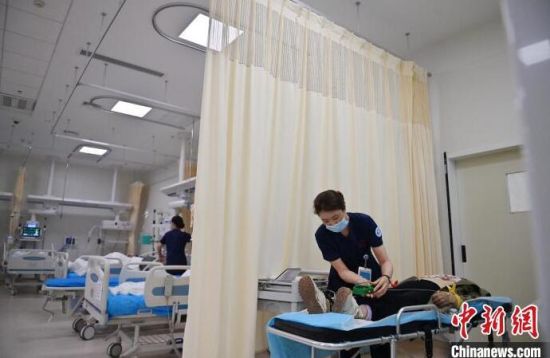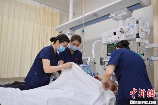 張力(中)在護(hù)理病人。急診科的工作環(huán)境突發(fā)情況多、體力消耗大,所以對急診護(hù)士的抗壓能力和應(yīng)變能力要求也更高。 張瑤 攝