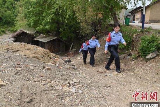 “女子警務(wù)團(tuán)”來(lái)到村里走訪。崔藝琳(右一)說(shuō),轄區(qū)里很多村子道路難行,但從沒(méi)阻止她們前行的腳步!埇 攝
