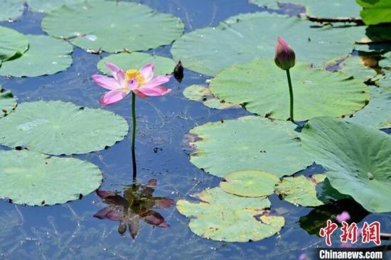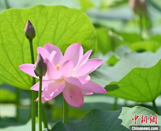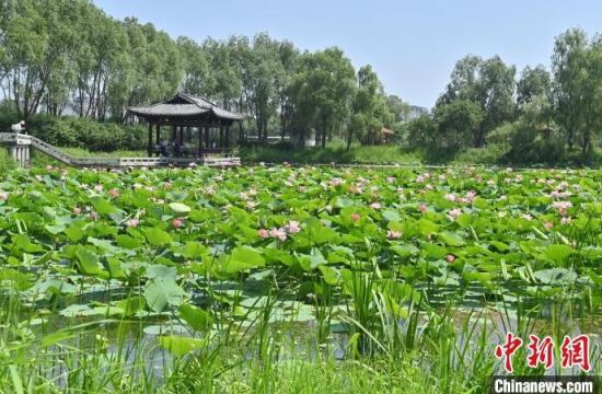 7月9日,在長春北湖國家濕地公園內,悄然綻放的荷花與翠綠的荷葉相互映襯,如詩如畫,吸引游客前來欣賞。(中新社記者 張瑤/攝)
