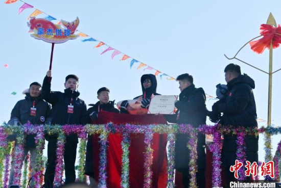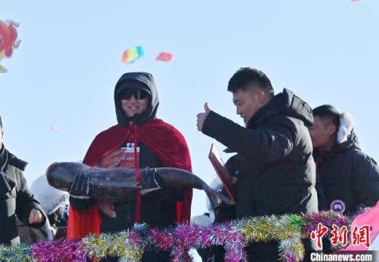 12月28日,吉林查干湖第23屆冰雪漁獵文化旅游節(jié)開幕。當(dāng)天,在查干湖湖面上舉行的“頭魚”拍賣儀式上,“頭魚”拍出1199999元人民幣。 中新社記者 張瑤 攝