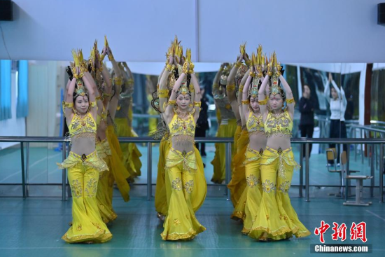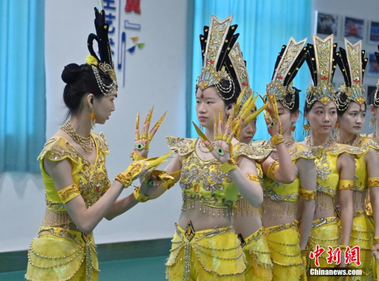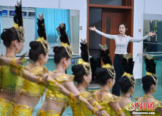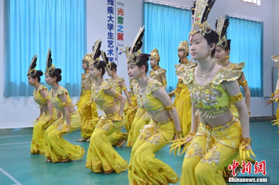 4月22日,在長(zhǎng)春大學(xué)特殊教育學(xué)院,學(xué)生們?cè)谂啪殹肚钟^音》。這所學(xué)院擁有一支由29名聽障學(xué)生組成的舞蹈團(tuán)隊(duì)。他們因?qū)ξ璧傅臒釔鄱奂谝黄,在無聲的世界中舞出他們精彩的人生篇章。中新社記者 張瑤/攝