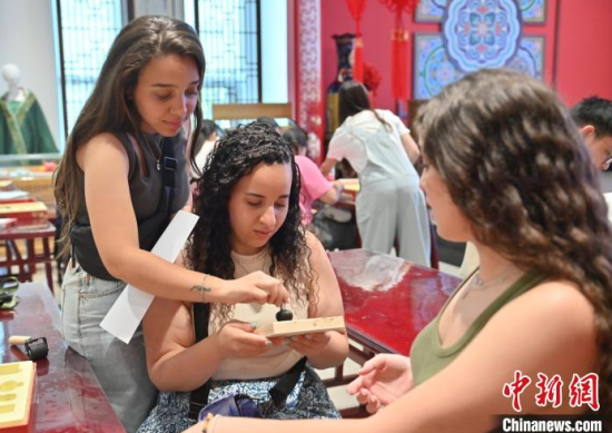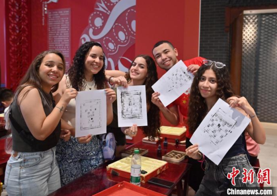 6月24日,吉林長春,埃及青年體驗(yàn)活字印刷術(shù)。當(dāng)天,來自美國、埃及、印度尼西亞等國家的青年在長春體驗(yàn)?zāi)嗨、活字印刷術(shù),參觀一汽紅旗文化展館,近距離感受中國文化的魅力。中新社記者 張瑤 攝