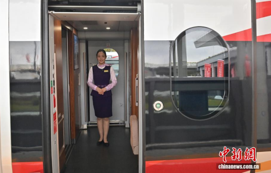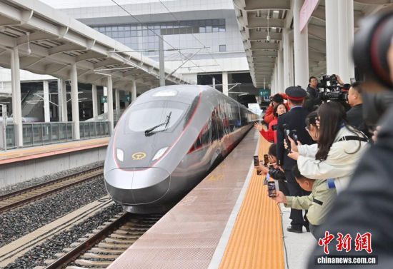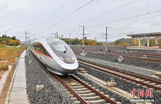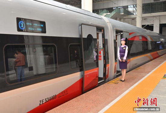 9月28日,G8166次列車從長白山站始發(fā),駛向終點(diǎn)站沈陽北站,沈白高鐵正式開通運(yùn)營,結(jié)束了吉林省通化、白山兩市不通高鐵的歷史,北京朝陽站、沈陽北站至長白山站的最短旅行時間分別為4小時33分、1小時53分。作為中國東北高鐵網(wǎng)重要組成部分,該線路對暢通區(qū)域經(jīng)濟(jì)循環(huán)、促進(jìn)沿線旅游資源開發(fā)等具有重要作用。中新社記者 張瑤 攝
