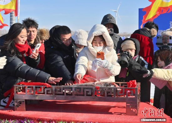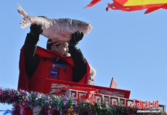 1月8日,吉林·松原查干湖第24屆冰雪漁獵文化旅游節(jié)開幕。當(dāng)天,在查干湖湖面上舉行的“頭魚”拍賣儀式上,“頭魚”拍出了1699999元人民幣。 中新社記者 張瑤 攝
