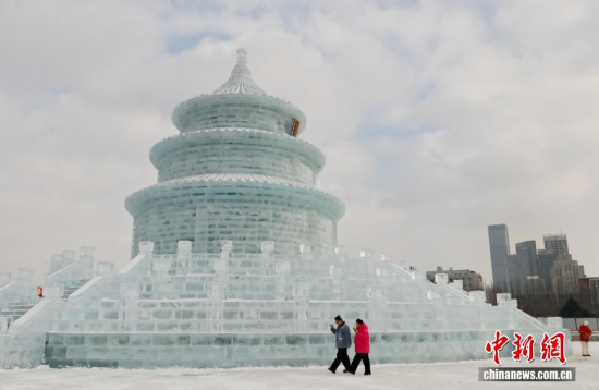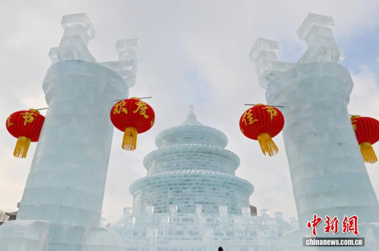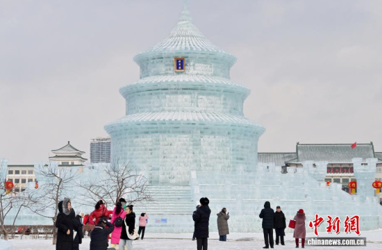 1月12日,在長春市的文化廣場上,一座以北京天壇祈年殿為原型的巨型冰雕成為冬日一景。冰雕高約21米,用冰量5010立方米,飛檐、殿頂?shù)葌鹘y(tǒng)建筑細節(jié)均被精準復刻,陽光下晶瑩剔透,配合紅燈籠冰柱點綴,盡顯中式浪漫韻味,吸引眾多游客前來拍照打卡。中新社記者 張瑤 攝