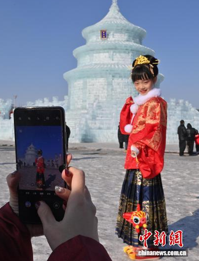 1月24日,長春市文化廣場上,眾多漢服愛好者齊聚巨型冰雕“祈年殿”前拍照留念。該冰雕以北京天壇為原型,通體晶瑩,飛檐斗拱皆現(xiàn)冰雪之韻。衣袂飄飄的漢服身影與剔透冰雕相映成趣。中新社記者 張瑤 攝