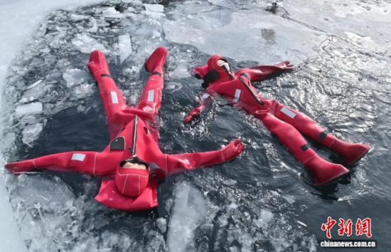 2月5日,吉林省長(zhǎng)春市,一項(xiàng)獨(dú)特的冰浮項(xiàng)目吸引眾多游客前來體驗(yàn)。在嚴(yán)寒天氣中,參與者身穿醒目的紅色浮力裝備,悠然漂浮于冰面之上,感受別致的冰雪樂趣。圖為游客在下水前拍照留念。中新社記者 張瑤 攝