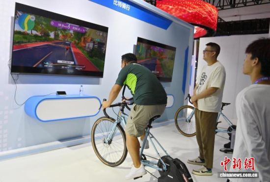 2023年8月24日,吉林長(zhǎng)春,市民體驗(yàn)比特騎行,感受數(shù)智競(jìng)技運(yùn)動(dòng)的樂趣。第十四屆中國—東北亞博覽會(huì)首次設(shè)置現(xiàn)代裝備與新能源合作主題館,集中展示人工智能平臺(tái)、新能源智能轎跑、制氫整流電源等裝備和產(chǎn)品。
