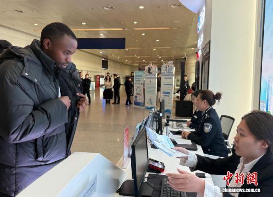 1月20日,吉林長春,外國留學生在長春龍嘉國際機場“吉便利”出入境一站式綜合服務(wù)窗口辦理相關(guān)業(yè)務(wù)!≈行律缬浾 張瑤 攝